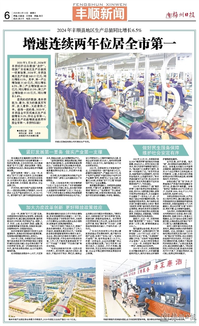 2024年,丰顺培育壮大智能制造产业,立讯智造项目一期产值突破35亿元,威富项目建成投产、产值超5000万元,电子电声产业荣获“中国优秀电子电声元件产业集群”称号,净增“四上”企业34家、总量达240家,实现省“百千万工程”首批典型村“四上”企业全覆盖。