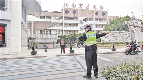 开学首日,梅州交警提前部署,全力保障学校周边道路通行安全与畅通。早上7点30分,记者在梅城江南育才小学看到,执勤民警已提前到岗,在小学周边路口的斑马线站岗执勤,指挥交通,引导接送学生车辆即停即走,和志愿者们一起护送孩子们安全过马路,有序进入校园。