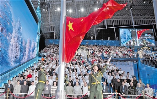 20时整,闭幕式开始。全体起立,高唱中华人民共和国国歌,鲜艳的五星红旗冉冉升起。