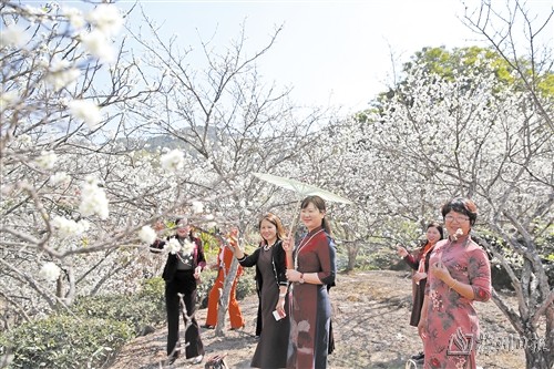 走进华东村,只见洁白的李花沿着山坳肆意绽放,蜜蜂在花瓣间飞舞,带来独属于春天的浪漫。游客们漫步其间,沉醉在这片花海之中,纷纷拍照留念。“为保障游客顺利出行,我们提供详细交通指引,各赏花村规划了专门停车区域。同时还在华东村和公平村设置农产品展销点,展销李果脯、巴戟、茶叶等特色农产品。”双华镇党委副书记曾益锋介绍说。