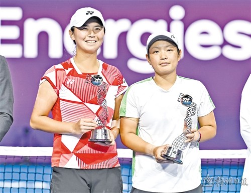 2月15日,亚军组合蒋欣玗(右)/吴芳娴在颁奖仪式上。当日,在WTA卡塔尔公开赛双打决赛中,蒋欣玗(中国)/吴芳娴(中国台北)组合0∶2不敌意大利组合埃拉尼/保利尼,获得亚军。