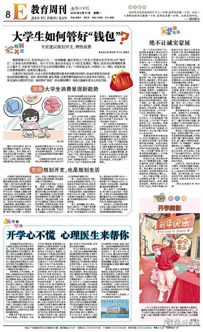 寒假聚餐50元、生活用品20元……每晚睡前,嘉应学院大三学生小颂都会打开手机APP“随手记”,记录每天的消费情况。每个月月初,她还会总结上个月的支出情况。“餐饮、生活用品等刚需消费比之前少了,用在学习或电子产品上的花销则增长了些。”小颂总结发现,与刚进入大一相比,现在的自己消费更趋理性,也更加注重品质。