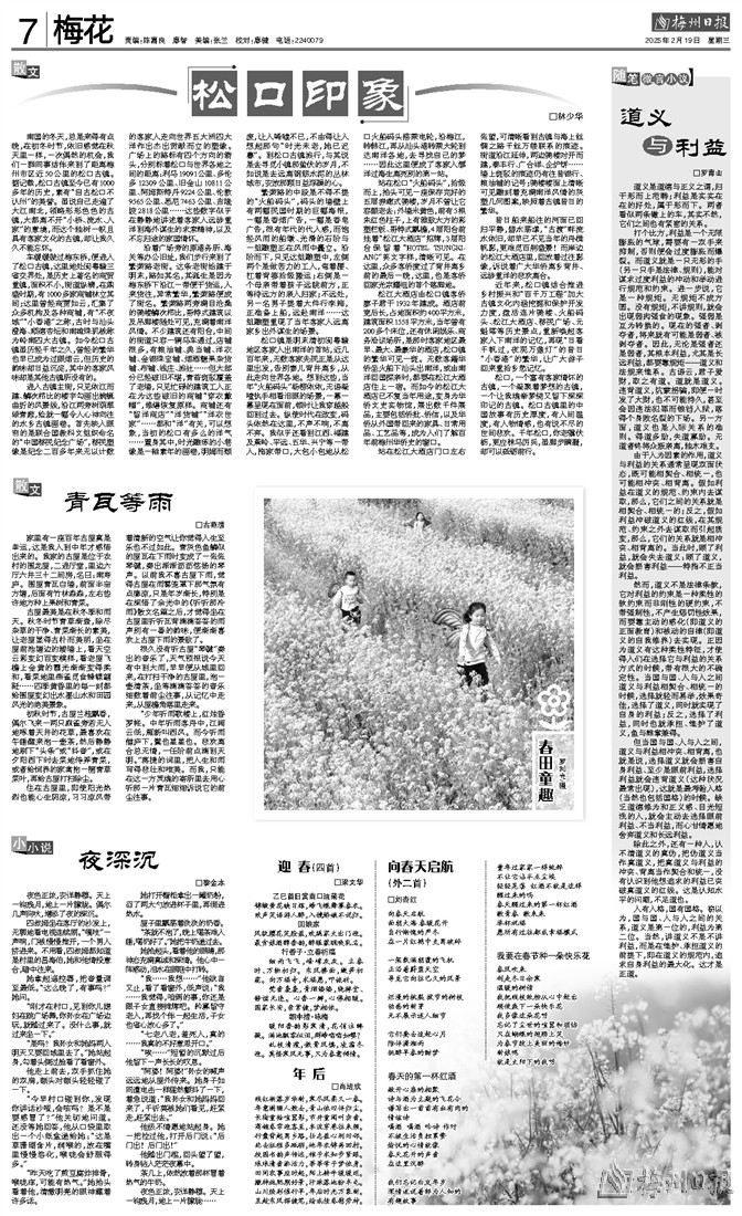 松口,一个富有客家情怀的古镇,一个凝聚着梦想的古镇,一个让我魂牵梦绕又留下深深印记的古镇。松口古镇里的中国故事有历史厚度,有人间温度,有人物情感,也有说不尽的世间悲欢。千年松口,你老骥伏枥,更应秣马厉兵,虽脚步蹒跚,却可以砥砺前行。