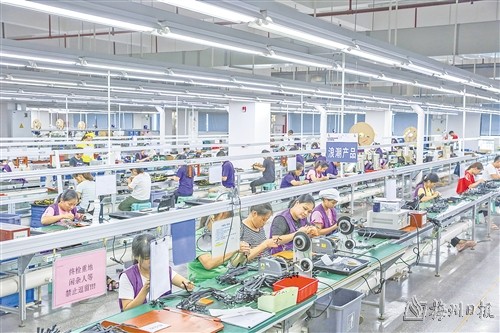 在位于广州天河(兴宁)产业转移工业园的兴宁立讯技术有限公司,各条生产线的工作紧密衔接、井然有序。工人们有的在操作控制面板,有的在拼装产品,有的在检查产品质量,大家各司其职,紧密配合,生产线高效运转。面对订单量的增长,兴宁立讯技术有限公司去年底在坭陂镇扩充了新厂区,今年将向年产值3亿元的目标努力。