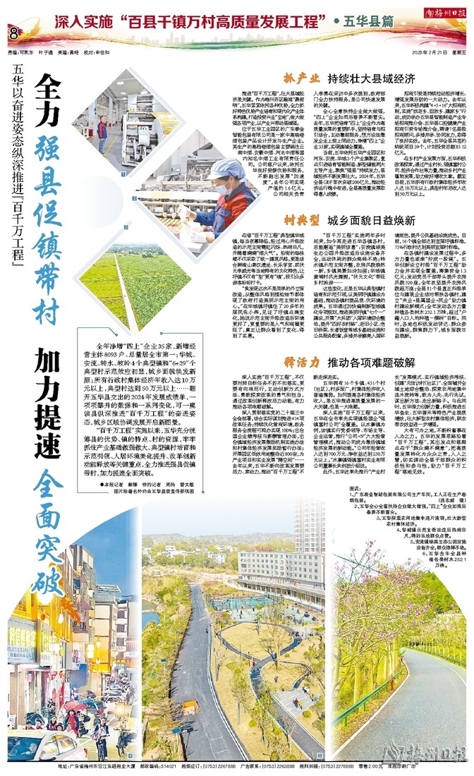 全年净增“四上”企业35家,新增经营主体8093户、总量居全市第一;华城、安流、转水、岐岭4个典型镇和“6+29”个典型村示范效应初显,城乡面貌焕发新颜;所有行政村集体经济年收入达10万元以上,典型村达到50万元以上……翻开五华县交出的2024年发展成绩单,一项项攀升的数据和一系列变化,可一窥该县纵深推进“百千万工程”的奋进姿态,城乡区域协调发展开启新图景。