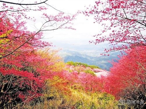 行至山巅,俯瞰樱林全貌,浩浩荡荡,似火如霞,蔚为壮观。远处黛山连绵,与这烂漫樱花相映成趣,一幅天然画卷尽收眼底。阳光洒下,花影斑驳,光影交错间,如梦似幻。