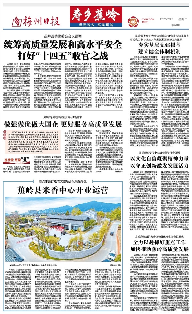 本报讯 (记者杨乔颖 特约记者徐志宝)日前,蕉岭县米香中心开业仪式在长潭镇白马村举行。这标志着蕉岭县在以点带面打造农文旅融合发展先导区上迈出了坚实一步,为接下来推动全县农文旅融合发展开了好头、作了示范。广东省市场监管局粤西办副主任、蕉岭县委副书记肖纯辉,县委常委、副县长王映萍,四季文旅控股集团副总裁赵子南等出席开业仪式。