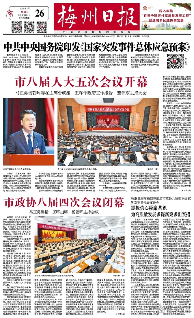 王晖在报告中指出,2025年是进一步全面深化改革、奋力推进中国式现代化梅州实践的关键一年,也是“十四五”规划收官之年。今年政府工作总体要求是:以习近平新时代中国特色社会主义思想为指导,全面贯彻落实党的二十大和二十届二中、三中全会以及中央经济工作会议、中央农村工作会议精神,深入学习贯彻习近平总书记对广东系列重要讲话和重要指示精神,按照省委“1310”具体部署、省政府工作安排和市委工作要求,坚持稳中求进工作总基调,完整准确全面贯彻新发展理念,服务和融入新发展格局,扎实推动高质量发展,持续用力推进“百千万工程”,加力推进苏区融湾先行区建设,进一步全面深化改革,扩大高水平对外开放,建设现代化产业体系,统筹推进城乡融合、绿美梅州、文化强市、重点民生、安全发展工作,推动经济持续回升向好,不断提高人民生活水平,保持社会和谐稳定,高质量完成“十四五”规划目标任务,为实现“十五五”良好开局打牢基础,推动中国式现代化梅州实践迈出新步伐。