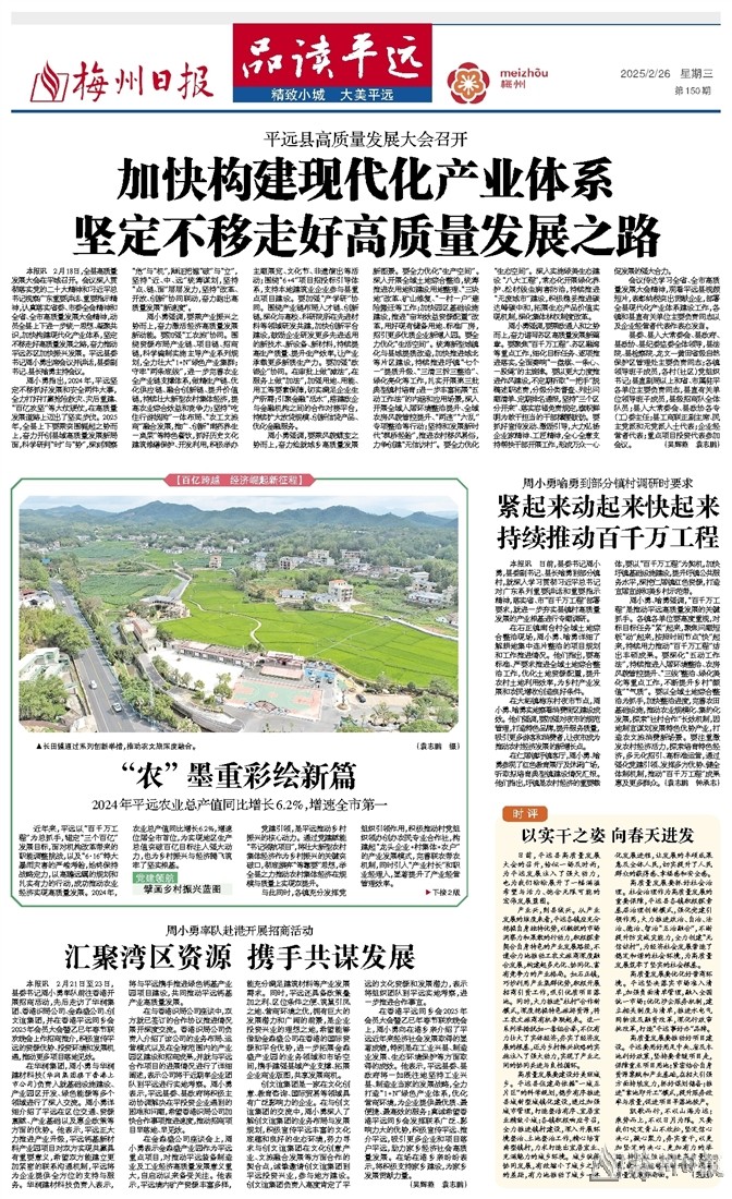 周小勇、喻勇强调,“百千万工程”是推动平远高质量发展的关键抓手。各镇各单位要高度重视,对标目标任务“紧”起来,聚焦问题短板“动”起来,按照时间节点“快”起来,持续用力推动“百千万工程”结出丰硕成果。要深化“五动工作法”,持续推进人居环境整治、农房风貌管控提升、“三线”整治、绿化美化等重点工作,不断提升乡村“颜值”“气质”。要以全域土地综合整治为抓手,加快整治进度,完善农田基础设施,推动农业规模化、集约化发展,探索“社村合作”长效机制,因地制宜谋划发展特色优势产业,打造农文旅消费新场景。要注重激发农村经济活力,探索培育特色经济,多元化招引、高标准运营,通过强化党建引领、发挥多方优势、健全体制机制,推动“百千万工程”成果惠及更多群众。(袁志鹏 钟承志)