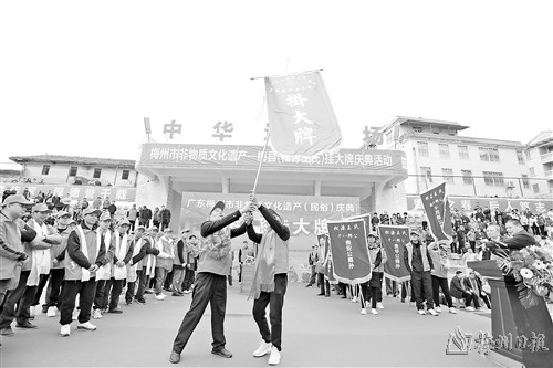 本报讯 (记者吴丽伶)2月25日,梅县区松源镇举行“挂大牌”非遗民俗活动,这是松源王氏世世代代遵循“厚德传家”良好家风于每年农历正月二十八举行的庆典活动。该活动于2020年被列入梅州市第九批市级非物质文化遗产代表性项目名单。