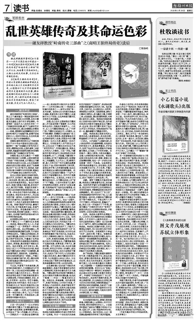 谢友祥教授所著的《血日苍茫——太平天国在南方的最后一个传奇》《南汉国传奇》《南明王朝终局传奇》“岭南传奇三部曲”的大开大合,给南粤文学添砖加瓦;大雅大俗的民间叙事,为历史传奇增色添彩。