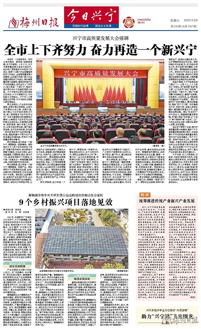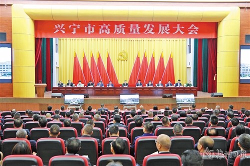 本报讯 (记者陈思杰 特约记者刘海阳 廖雨帆)奋楫逐春潮,实干开新局。2月21日,兴宁市高质量发展大会在兴城召开。会议深入贯彻落实中央经济工作会议、省委十三届六次全会暨省委经济工作会议、全省高质量发展大会精神,以及梅州市委八届十次全会暨市委经济工作会议、梅州高质量发展大会精神,围绕加快现代化产业体系建设,动员全市上下齐努力,奋力再造一个新兴宁,推动中国式现代化兴宁实践取得更大突破。兴宁市委书记罗达祥出席会议并讲话,兴宁市委副书记、市长赵超文主持会议。兴宁市人大常委会主任邓强、兴宁市政协主席陈日新出席会议。