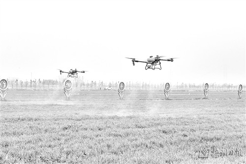 3月5日,在安徽省铜陵市郊区普济圩农场的麦田里,无人机在给小麦施肥(无人机照片)。