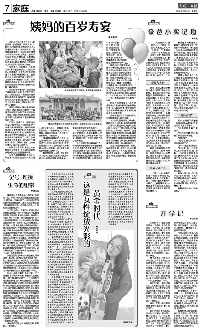 乙巳正月初三是个好日子,春光明媚,春暖花开。举国欢庆,大家仍沉浸在新春佳节的欢乐中。沾着新年的喜气,姨妈百岁有二祝寿聚会隆重举行,地点设在中楼村文明活动中心的上祠堂。姨妈平生勤俭节约,朴素自谅,不愿增添儿女们的麻烦,反对举办隆重豪华祝寿宴会,晚辈尊重老人家的观点,改为简单节约的亲人聚会。