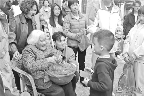拍完大合照,我恭敬地为姨妈送上祝寿红包,众亲争着跟上,把姨妈团团围住,我嚷着大家不要争,要排队进行,禾坪上排起了送红包的长龙。
