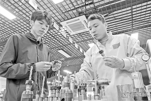 在广东省机械技师学院,杨登辉(右)指导学生选择数控铣床铣削刀具(2月25日摄)。