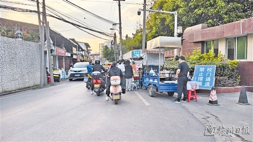 本报讯 (记者陈坚平)“学校门口的道路被流动摊贩占了,人车很难通行。”近日,有市民向本报《民生一线》栏目反映,在梅城江北的嘉应学院医学院周边,有一些流动摊贩每天傍晚时分开始聚集在学校周边,存在着食品安全、妨碍道路通行、影响环境卫生等问题,给学校师生、路过的市民带来不少烦恼。