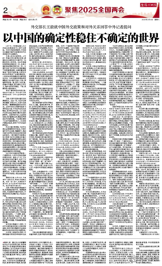 新华社记者:您刚刚提到,2024年的中国外交为动荡不安的世界注入宝贵稳定性。2025年的国际形势可能更加变乱交织,中国外交又将发挥什么作用?