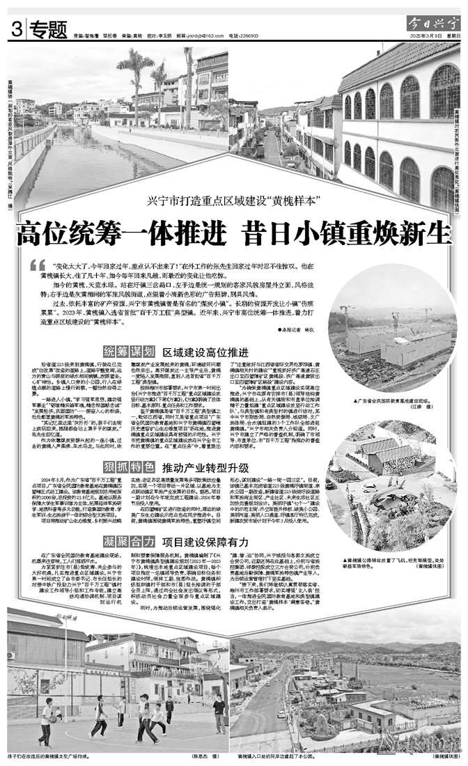 为紧紧抓住市(县)级统筹、央企参与的大好机遇,扎实推进重点区域建设,兴宁市第一时间成立了由市委书记、市长任组长的对接中铁广投助力兴宁“百千万工程”镇村建设工作领导小组和工作专班,建立高效沟通协调机制、项目谋划运行机制和要素保障服务机制。黄槐镇编制了《兴宁市黄槐镇典型镇建设规划(2023年—2025年)》,梳理出本地重点区域建设项目,每个项目指定一名镇领导负责,明确目标任务和建设时限,倒排工期、挂图作战。黄槐镇积极组织镇村干部和市(县)组长抽调的干部全员上阵,通过向全社会发出倡议等形式,积极动员社会力量全面参与重点区域建设。