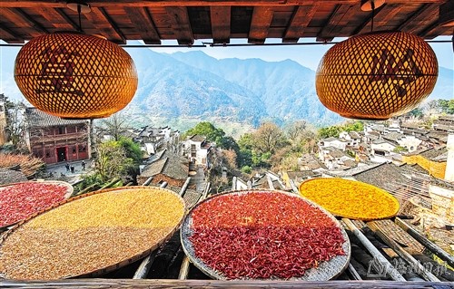 篁岭有“春晒茶叶、夏晒辣椒、秋晒果蔬、冬晒乡俗”的独特晒秋文化。你看,在晒工坊,火红的辣椒、金黄的玉米、圆溜溜的南瓜、白嫩嫩的萝卜条等,皆用圆圆的“簸箕”晾晒在民居土砖外墙与晒架上,生活就是这样造就了篁岭绝无仅有的“晒秋人家”。