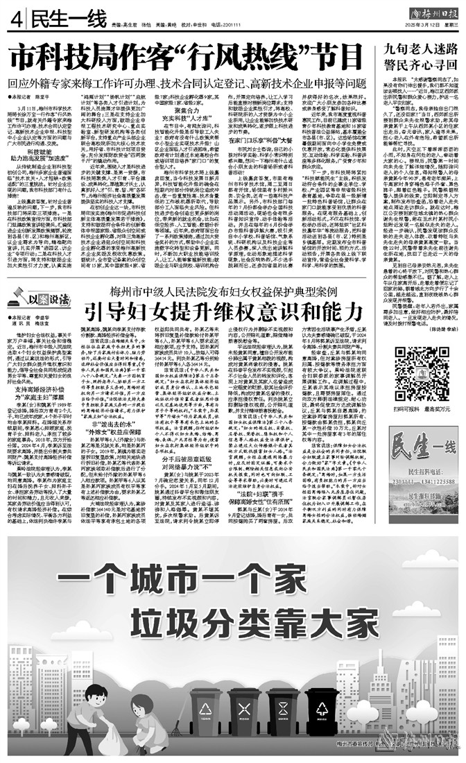 ●本报记者 李盛华 通讯员 梅法宣 维护妇女合法权益,事关千家万户幸福,事关社会和谐稳定。近日,梅州市中级人民法院选取4个妇女权益保护典型案例,通过以案说法的形式,引导广大妇女群众提升维权意识和能力,倡导全社会共同形成促进男女平等、尊重和关爱妇女的良好社会风尚。