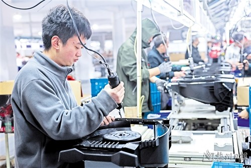 3月11日,在位于慈溪市横河镇的宁波好使特电器有限公司的车间内,工人在流水线上组装一批出口的园林工具。