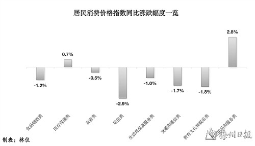 分类别看,CPI八大类商品(服务)价格环比呈“2平6降”态势。其中,医疗保健价格、交通通信价格均持平;其他用品及服务价格下降1.4%,教育文化娱乐价格下降0.9%,衣着价格、生活用品及服务价格均下降0.6%,食品烟酒价格下降0.2%,居住价格下降0.1%。