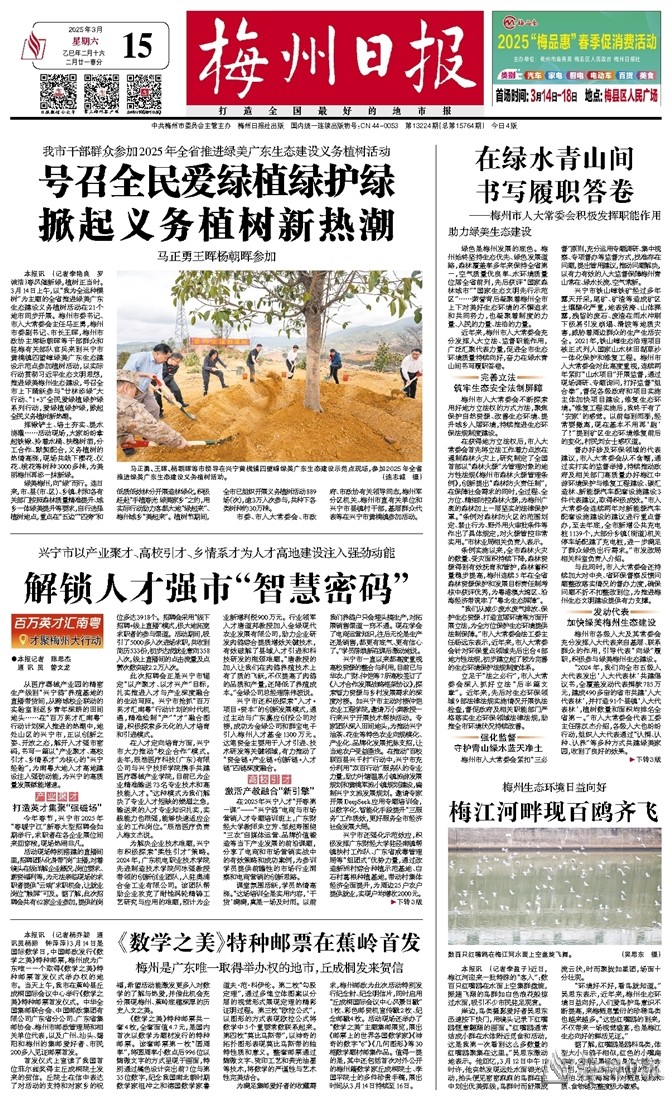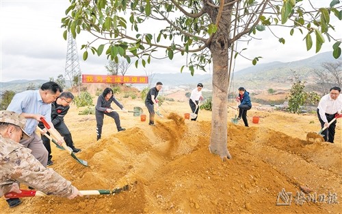 本报讯 (记者李艳良 罗诚浩)春风催新绿,植树正当时。3月14日上午,以“我为全运种棵树”为主题的全省推进绿美广东生态建设义务植树活动在21个地市同步开展。梅州市委书记、市人大常委会主任马正勇,梅州市委副书记、市长王晖,梅州市政协主席杨朝晖等干部群众和驻梅有关部队官兵来到兴宁市黄槐镇四望嶂绿美广东生态建设示范点参加植树活动,以实际行动贯彻习近平生态文明思想,推进绿美梅州生态建设,号召全市上下踊跃参与“廿林添绿”大行动、“1+3”全民爱绿植绿护绿系列行动,爱绿植绿护绿,掀起全民义务植树新热潮。