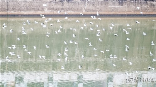 本报讯 (记者李盈子)近日,梅江河迎来一批特殊的“客人”:数百只红嘴鸥在水面上空集群盘旋,振翅飞翔的鸟群如白色浪花般掠过水面,吸引不少市民驻足观赏。