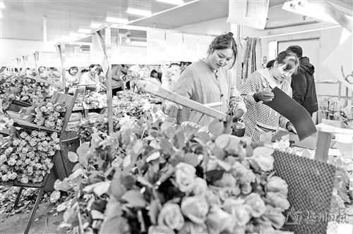 3月16日,花农在姚安毅云花卉有限公司分拣包装车间内包装鲜花。