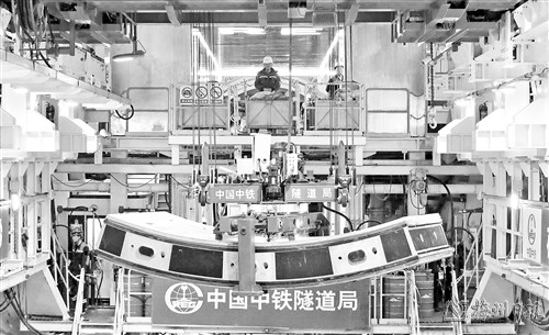 沪渝蓉高铁崇太长江隧道“领航号”盾构机管片吊装施工现场(3月16日摄)。