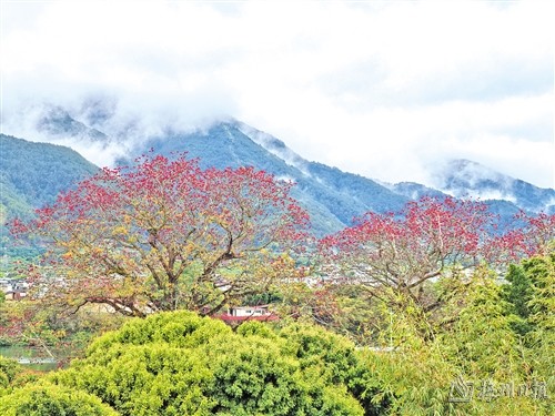 繁花扮靓乡间路。色尤亮,方经雨。如火红棉辉古渡。柚花香烈,风铃花吐,喇叭花常遇。