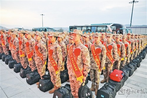 在高铁梅州西站,身着迷彩服、肩披绶带、胸戴红花的新兵军容严整、精神抖擞。军地领导纷纷寄语新兵,勉励他们坚持昂扬奋斗的姿态,弘扬苏区精神,传承红色基因,在军营熔炉中锻造本领,让“有灵魂、有本事、有血性、有品德”的新一代革命军人品格在战位闪光。梅州各地将落实拥军优属政策,用心用情用力为广大青年解决后顾之忧,为大家安心服役、建功立业当好坚强后盾。“穿上戎装成为人民军队中的一员后,我们将斗志昂扬,不怕苦不怕累,敢于挑战,为祖国繁荣富强和人民幸福安康贡献全部的力量。”来自梅县区的新兵吴富裕说。