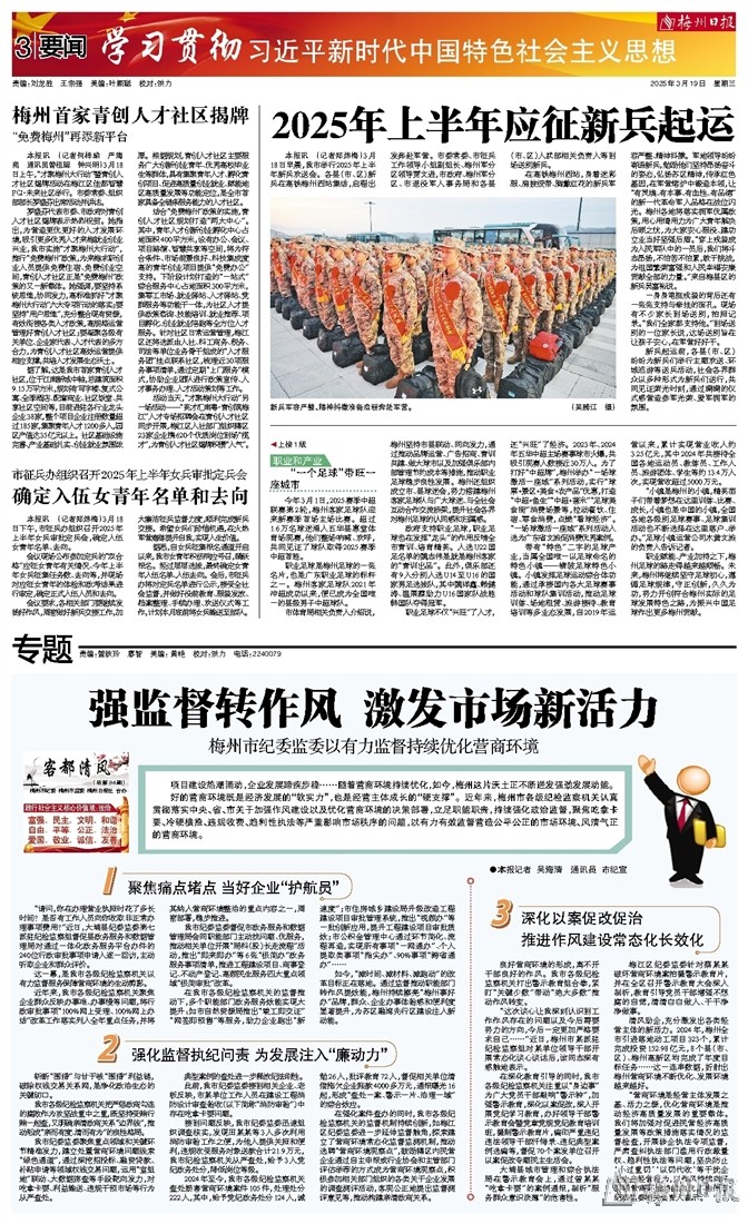 好的营商环境既是经济发展的“软实力”,也是经营主体成长的“硬支撑”。近年来,梅州市各级纪检监察机关认真贯彻落实中央、省、市关于加强作风建设以及优化营商环境的决策部署,立足职能职责,持续强化政治监督,聚焦吃拿卡要、冷硬横推、违规收费、趋利性执法等严重影响市场秩序的问题,以有力有效监督营造公平公正的市场环境、风清气正的营商环境。