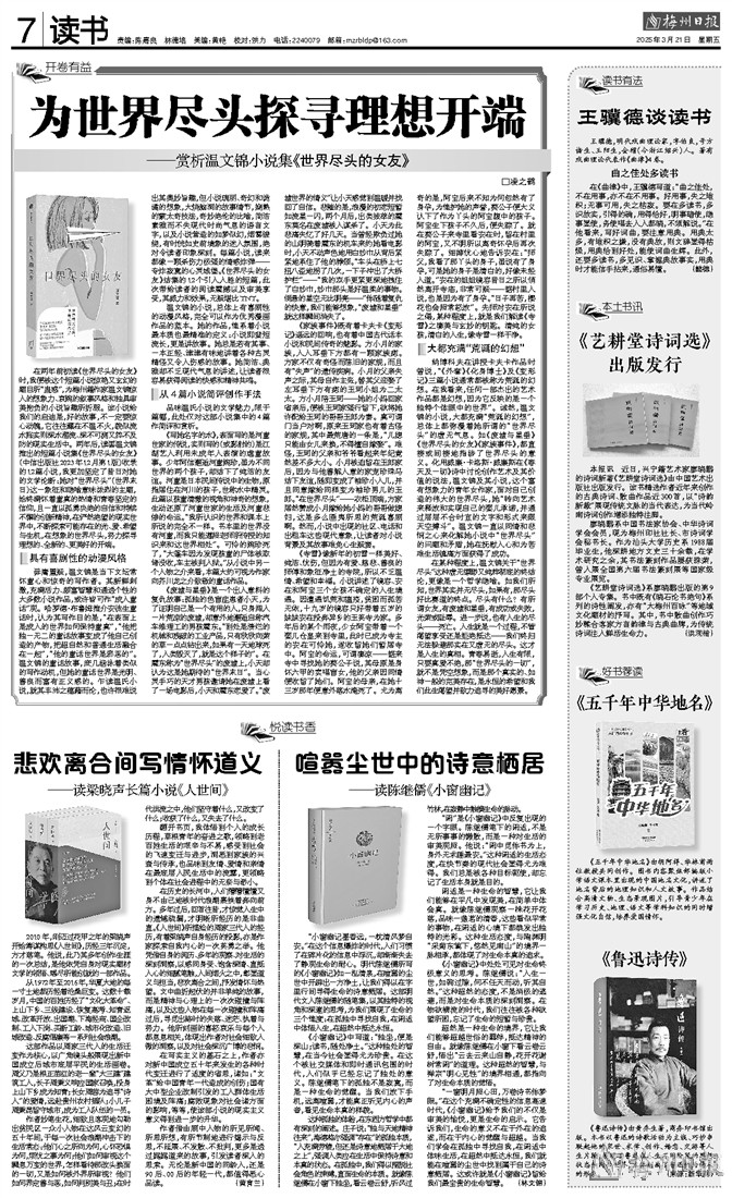 在两年前初读《世界尽头的女友》时,我便被这个短篇小说惊艳又玄幻的题目所“蛊惑”,为梅州籍作家温文锦惊人的想象力、哀婉的叙事风格和独具审美抱负的小说旨趣所折服。该小说给我们的启迪是,好的故事,不一定要惊心动魄,它往往藏在不温不火,貌似流水账实则深水潜流、深不可测又猝不及防的现实生活中。两年后,读罢温文锦推出的短篇小说集《世界尽头的女友》(中信出版社2023年12月第1版)收录的12篇小说,我更加坚定了昔日对她的文学论断:她对“世界尽头”(世界末日)这一象征和隐喻意味浓烈的主题,始终满怀着童真的热情和青春坚定的信仰,且一直以孤勇决绝的自信和持续不懈的创新精神,在俨然绝望的现实世界中,不断探索可能存在的光、爱、希望与生机,在想象的世界尽头,努力探寻理想的、全新的、更美好的开端。