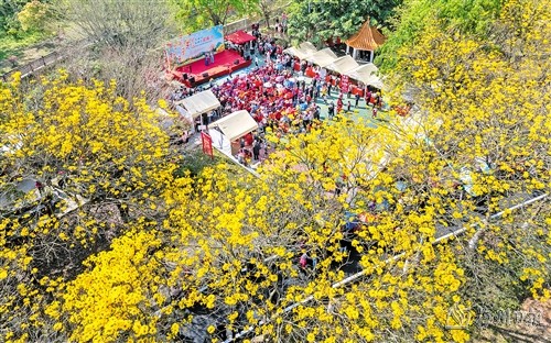 走在花间小道上,三两步便能看到拍照的游客,以及端着“长枪短炮”的摄影爱好者。在主办方设置的以黄花风铃为造型的“打卡点”前,不少人在排队等待,留下美照。一旁的蓝布村党建公园小广场上,竹板歌《兴宁新圩好地方》、杯花舞等非遗节目一一上演;镇村干部群众还自编自导了歌曲节目,给赏花的游客别样的感受。