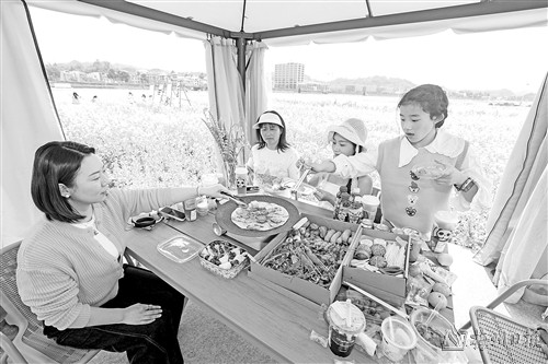 3月23日,游客们在更楼街道城南城市田园油菜花田边的帐篷里品尝美食。