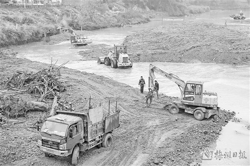 “广东建工负责三个镇,分别是长潭镇、新铺镇和三圳镇,共投入7台挖掘机、2台推土机及40余名作业人员。目前主体清淤工程已基本完成,剩余杂草及建筑垃圾正在组织外运。”广东省建筑工程集团股份有限公司建筑安装工程分公司蕉岭河道清淤项目负责人张嘉伦说。“我们目前负责蓝坊镇全长10余公里的河道清淤工程及南磜镇尚田村约1公里河段的清淤任务,两个镇总清淤量约2.3万立方米。”广东省建筑工程集团股份有限公司公路分公司蕉岭河道清淤项目经理邹金锡说。