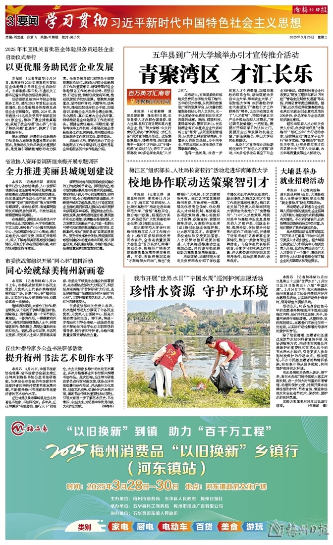 本报讯 (记者何梓瑜)3月22日是第三十三届“世界水日”,3月22日至28日是第三十八届“中国水周”。3月24日下午,市水务局联合梅州市嘉城义工协会开展巡河护河志愿服务活动,以实际行动保护母亲河,倡导绿色文明新风尚。