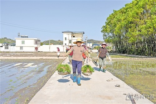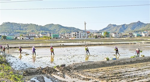 一年之计在于春。在石正镇南台村的稻田里,碧绿的秧苗随着春风泛起涟漪,而在不远处,几名村民正抱着育秧盘在抛秧,有说有笑,好一幅忙碌的田园美景。