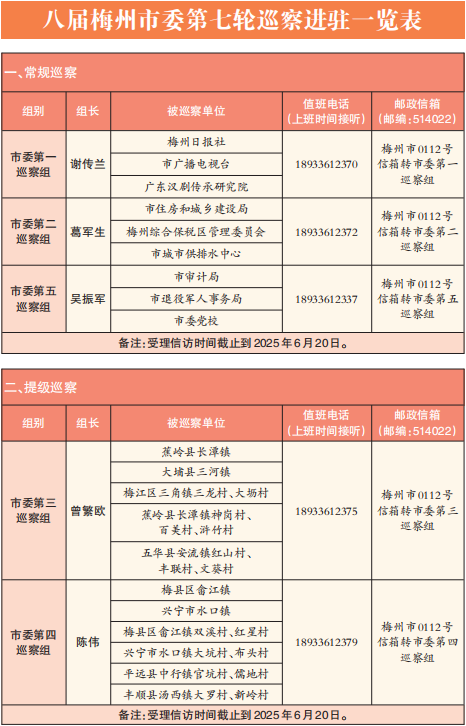 本报讯 根据市委巡察工作部署,八届梅州市委第七轮巡察将对9个市直单位党组织开展常规巡察,对4个镇、16个村党组织开展提级巡察。截至3月27日,5个市委巡察组全部完成进驻工作。