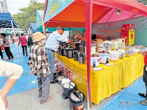 在家电以旧换新摊位前,不少市民带来了家里的旧电饭锅、电磁炉,驻足选购,在导购员试电确认没有质量问题后,心满意足地拿着新选购的电器回家。