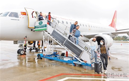 本报讯 (记者郑炜梅 通讯员洪梓娴)3月30日14时46分,一架喷涂“精卫鸟”标识的天津航空E190客机平稳降落在梅州机场,标志着海口⇌梅州⇌杭州航线开航。该航线是梅州机场执行2025年夏秋航季后开通的第一条新航线。