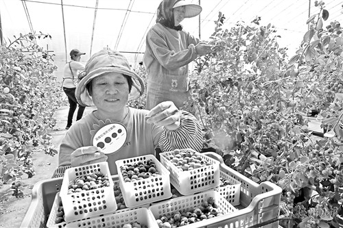 3月30日,村民在青岛西海岸新区张家楼街道丰禾园家庭农场采摘蓝莓。