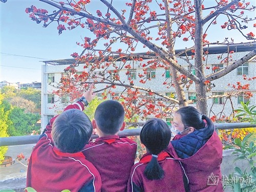 梅江区作新小学的校园里有几棵高大的木棉树,枝干遒劲,催人奋发,给人力量。阳春三月,春暖花开,木棉树上更是花团锦簇,鲜艳的花朵像跳动的火苗,映红了孩子们的笑脸。 (陈柳)