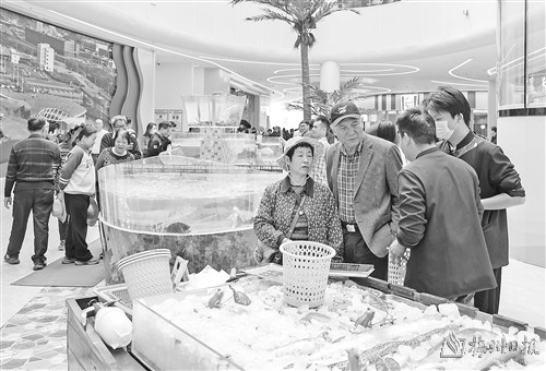 4月2日,旅客在深汕西高速长沙湾服务区餐厅选购汕尾海鲜。