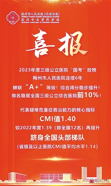 近日,2023年度三级公立医院“国考”放榜,梅州市人民医院在全国1588家三级公立综合医院中脱颖而出,连续6年蝉联“A+”等级,综合得分稳步提升,排名稳居全国三级公立综合医院前10%,再次交出了“硬核答卷”!其中“国考”核心考核指标CMI值(国际公认的代表医院救治疑难危重症能力的重要指标)1.40,较上一年度CMI值1.39(当年度位列全国12名)再进步。尤为令人振奋的是,根据国家卫健委等7部门近日发布的《2023年度全国三级公立医院绩效监测分析情况通报》,省级及以上医院CMI值平均水平为1.14,梅州市人民医院以1.40的硬核表现,跻身全国头部梯队。CMI值作为国际上衡量医院诊疗技术难度及收治疑难危重症能力的核心指标,是医疗机构技术实力的“硬核”对决,在“国考”以及公立医院高质量发展中占有非常重要的位置。