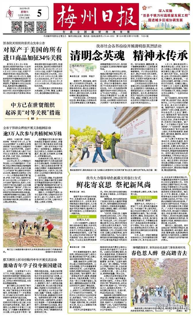本报讯 (记者江婵 罗诚浩 郑炜梅 何梓瑜)今年3月,以“我为全运种棵树”为主题的全省推进绿美广东生态建设义务植树活动在21个地市同步开展。近段时间,我市干部群众深入践行习近平生态文明思想,持续开展“植绿、护绿、兴绿”活动,为绿美梅州生态建设添砖加瓦。
