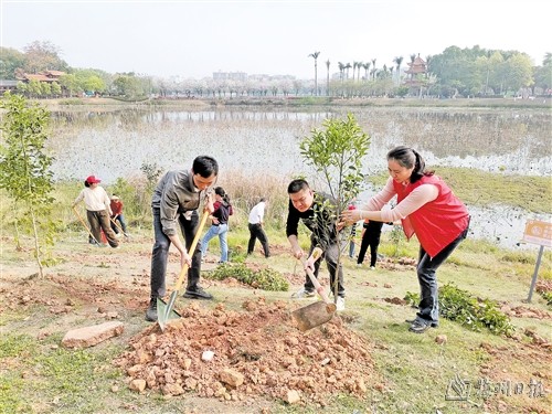 在梅城剑英公园,梅江区三角镇新塘村新时代文明实践站联合市交通运输局、市疾病预防控制中心、梅江区委政法委开展“我为梅江种棵树 共建绿美新家园”志愿植树活动,大家齐心协力栽种的160多株铁冬青树苗迎风挺立、生机勃勃。