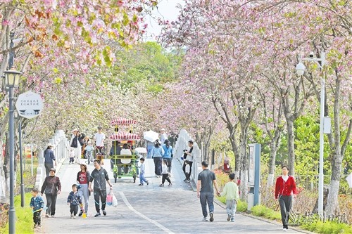 梅城剑英公园的紫荆花也迎来盛花期,满树繁花似锦,吸引众多市民扶老携幼、呼朋引伴前来观赏、拍照打卡,开启惬意的“公园漫步”之旅。“这里的花美得超乎想象,真的太开心了!”市民黄女士兴奋地说。